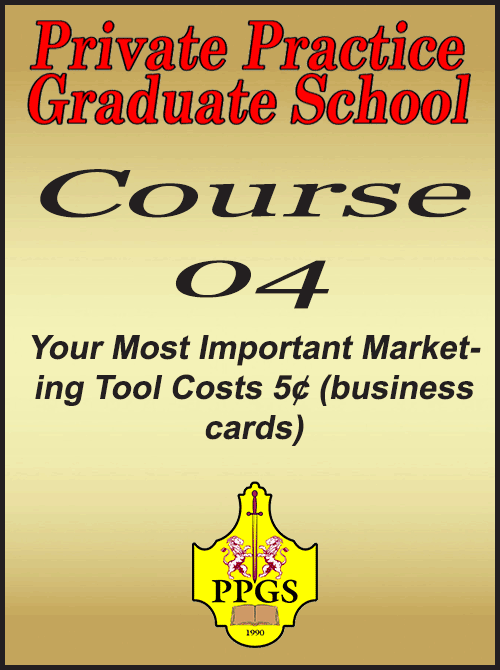 In this course you will learn how to build a fingertip billboard that lets the potential client receive your message in just three-seconds. Your well developed business card will inform and sell your practice by talking to, not at, your potential client. All this power for about 5¢ each.